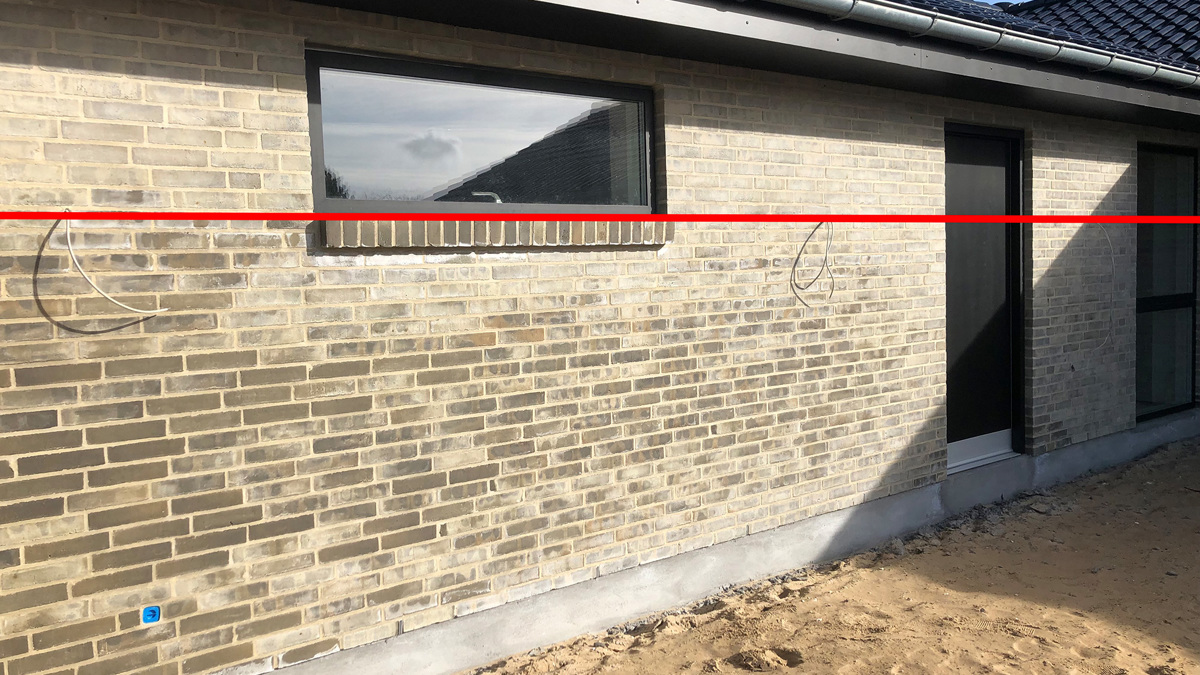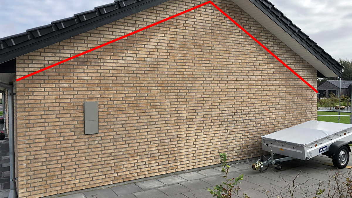 Under den røde streg, hvor murværket ikke er beskyttet af udhænget, er vejrligets påvirkning klassificeret som eksponeringsklasse MX 3.2. (Murværk der ikke er beskyttet af tagudhæng, som er udsat for fugt eller vandpåvirkninger samt frost og tø).